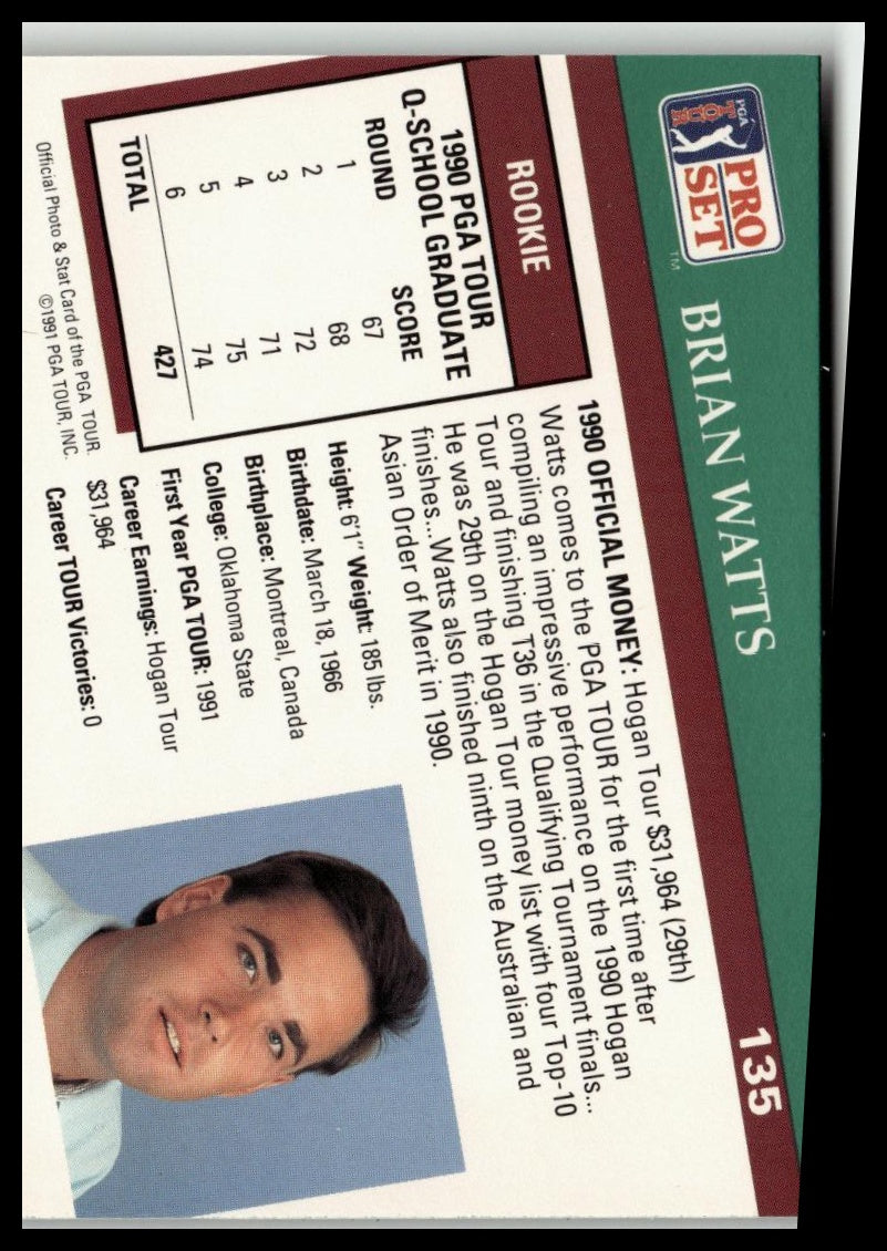 Golf Singles 1991 Pro Set PGA Tour #135 features Brian Watts, capturing a key phase in his professional golf career. This card offers detailed statistics and insights from the 1991 season, making it a valuable collectible for expert enthusiasts of authentic PGA Tour memorabilia. Its quality and historical significance enhance its appeal among serious vintage golf card collectors.