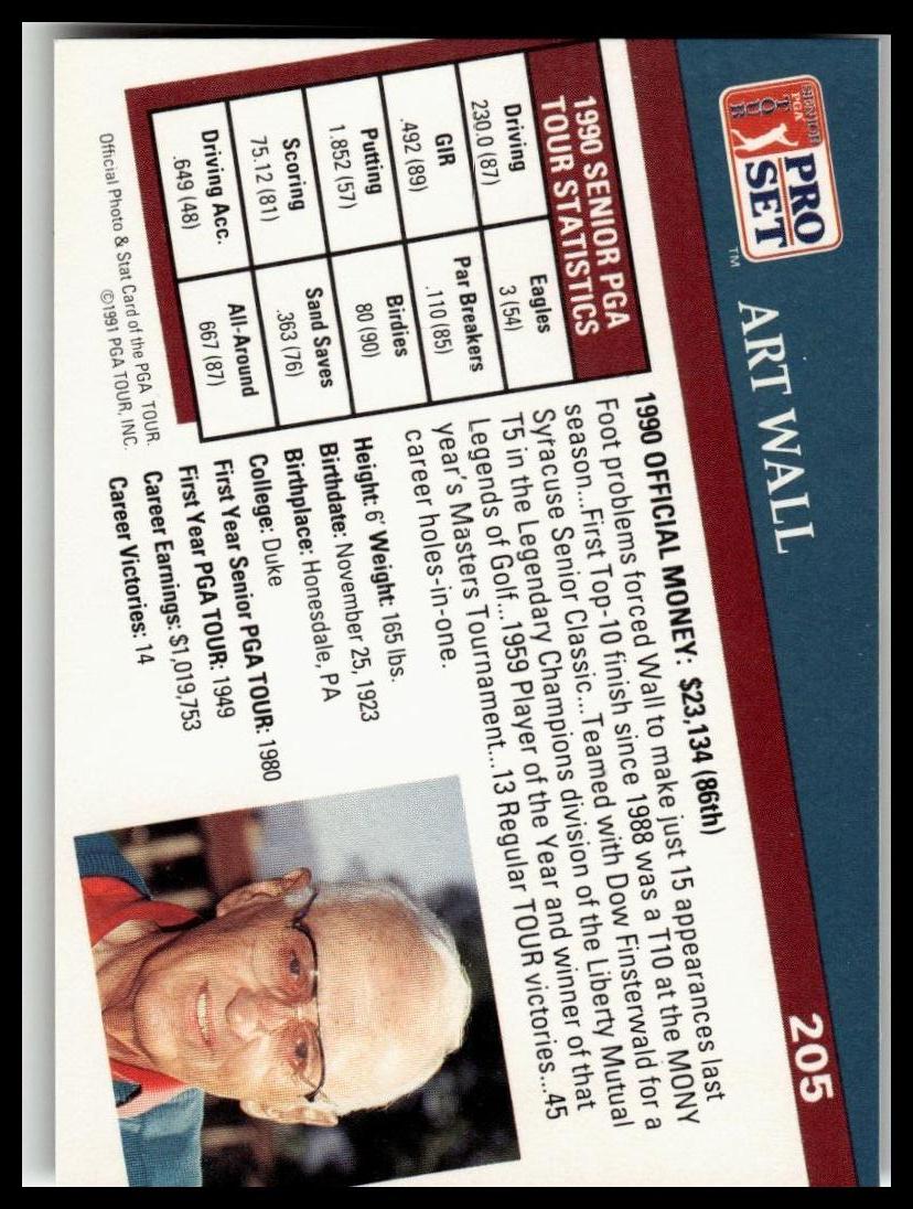 This Golf Singles 1991 Pro Set PGA Tour card features Art Wall, a renowned professional golfer known for his major championship victory and impactful career on the PGA Tour. As card #205 in the 1991 series, it offers collectors an authentic piece highlighting Wall’s significant contributions to golf history. This card is a valuable addition for enthusiasts dedicated to preserving notable player memorabilia from this era.