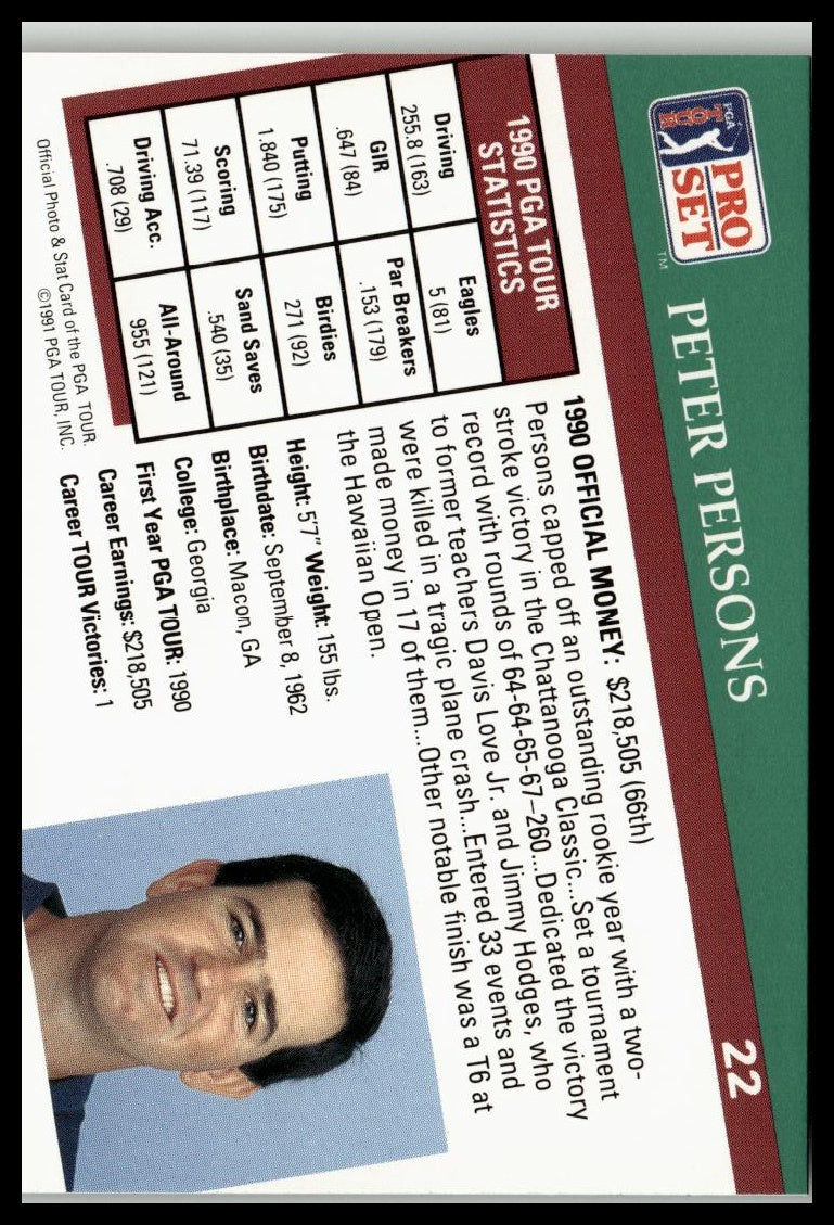 Golf Singles 1991 Pro Set PGA Tour #22 features Peter Persons, highlighting his professional career and performance during the 1991 PGA Tour season. This card offers detailed insights into Persons’ achievements, making it a valuable collectible for serious enthusiasts of vintage golf memorabilia. Its authenticity and condition contribute to its significance as a notable addition to expert collections and displays.