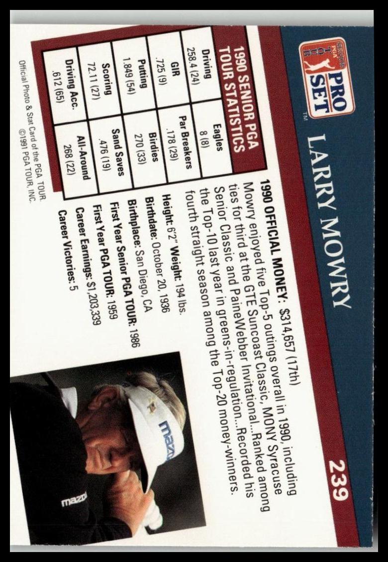 Golf Singles 1991 Pro Set PGA Tour #239 features Larry Mowry, highlighting his presence on the professional golf circuit during the 1991 season. This card offers detailed career statistics and insights, making it a valuable collectible for expert enthusiasts of authentic PGA Tour memorabilia. Its quality and historical significance contribute to its appeal within vintage golf card collections.