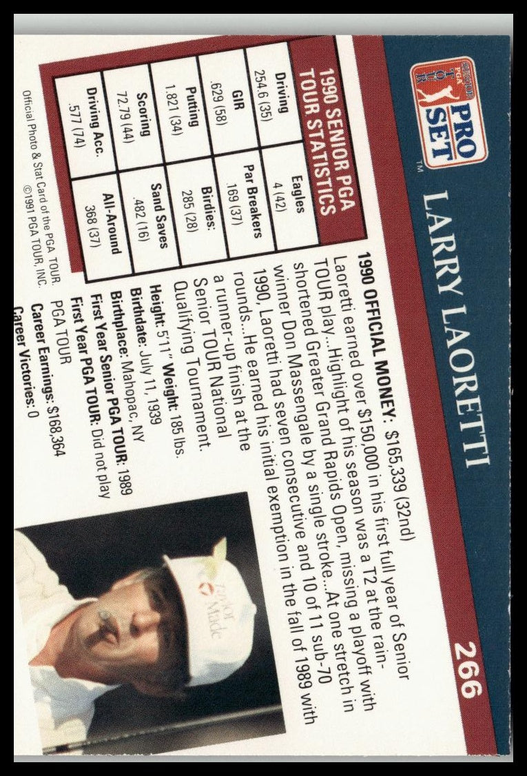 This Golf Singles 1991 Pro Set PGA Tour card features Larry Laoretti, a professional golfer known for his participation and competitive efforts on the PGA Tour. As card #266 in the 1991 series, it offers collectors an authentic piece highlighting Laoretti’s role in golf history. This card is a valuable addition for enthusiasts dedicated to preserving notable player memorabilia from this era.