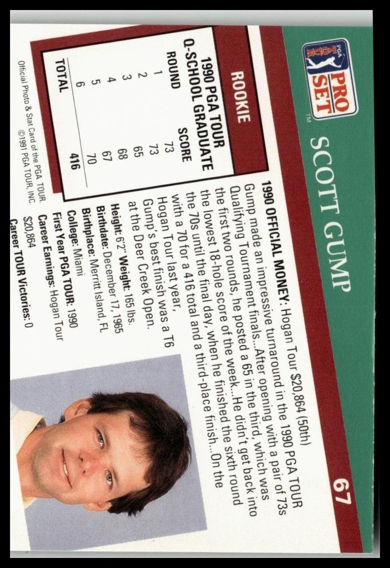 Golf Singles 1991 Pro Set PGA Tour #67 features Scott Gump, highlighting his professional golf career during the 1991 season. This card provides detailed statistics and career insights, making it a valuable collectible for expert enthusiasts focused on authentic PGA Tour memorabilia. Its quality and preservation contribute to its significance within vintage golf card collections.