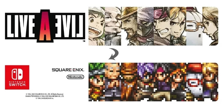 A designed Bookmark, from the release of Live A Live 2022 for the Nintendo Switch. Features the 8 Main Characters in artwork and battle sprites!