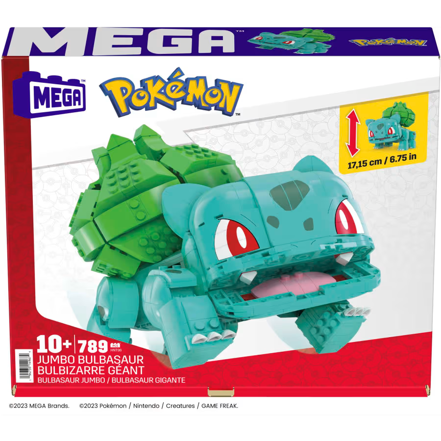 The Kanto region Pokémon Bulbasaur is ready to battle with this 789-piece building set. Featuring authentic details, including an opening mouth and poseable legs, you won't 'be-leaf' the display possibilities. This building set pairs well with other Jumbo Pokémon for endless building fun.