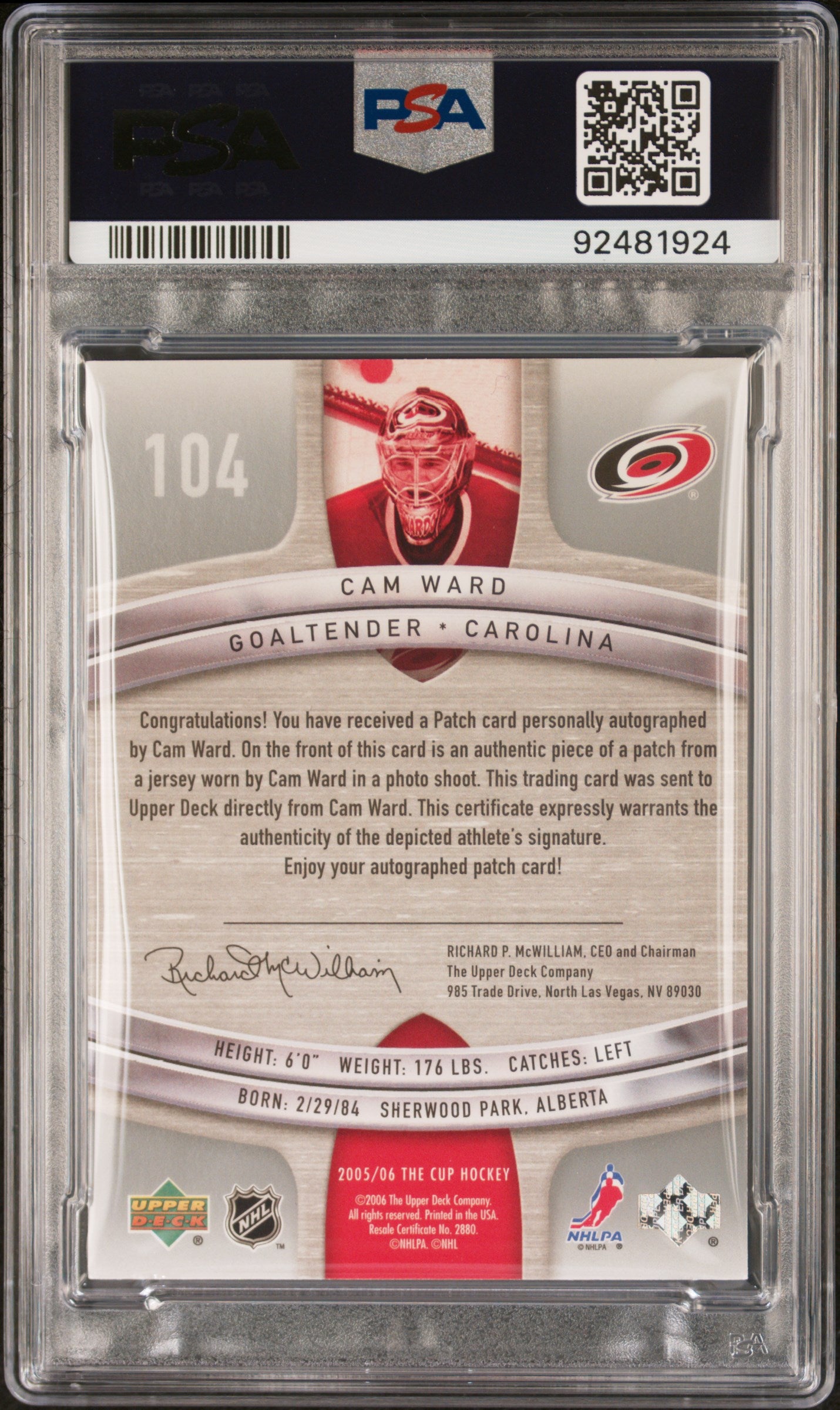 NHL Graded Card 2005 Upper Deck The Cup [104 Cam Ward Autograph Patch PSA 9