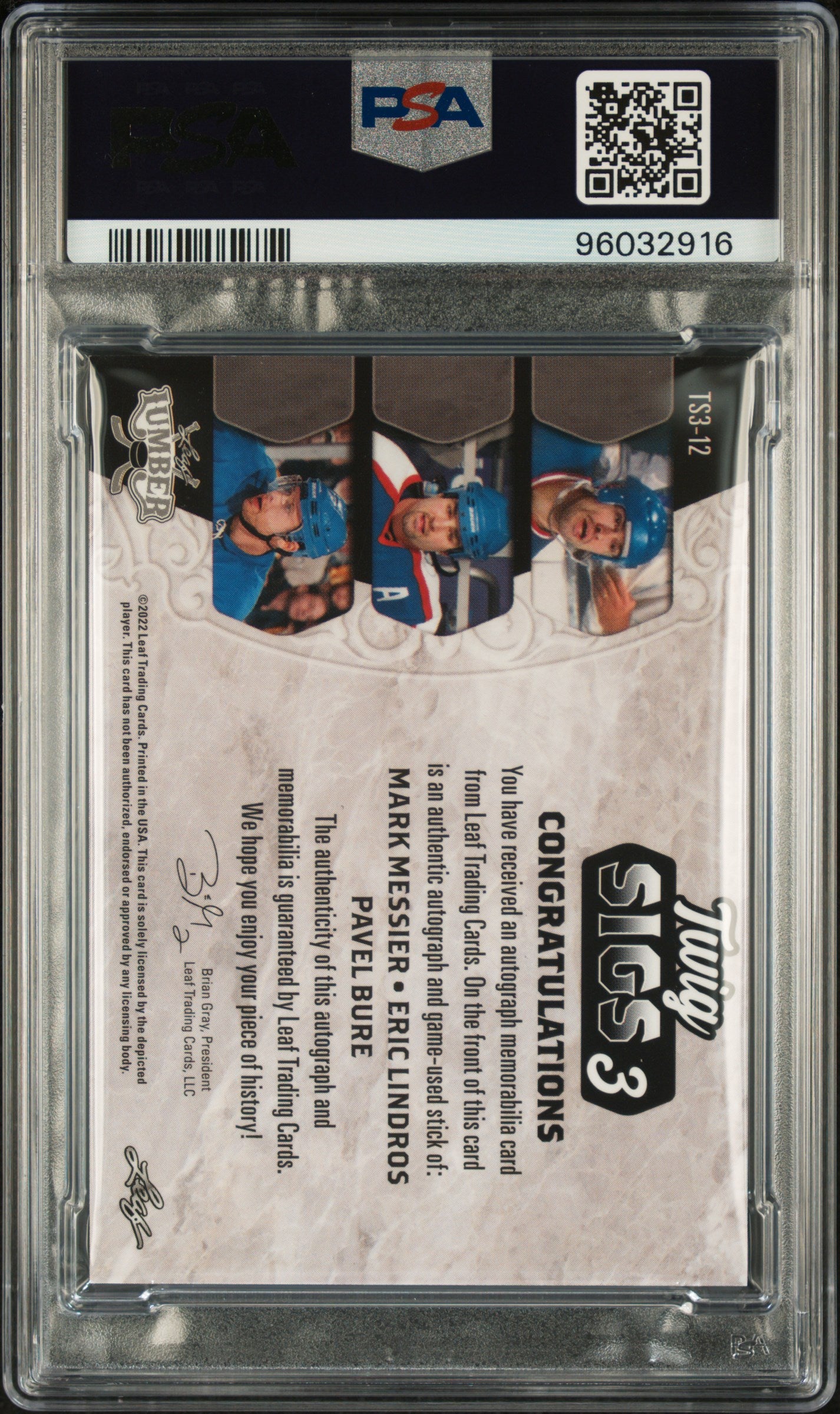 The 2021 Leaf Lumber Twig Sigs 3 #TS312 featuring Messier, Lindros, and Bure in the Pewter parallel, graded PSA 8, is a distinguished collectible showcasing signatures from three NHL legends. This card’s solid grade and unique design make it a prized addition for collectors seeking high-quality memorabilia of iconic hockey players.