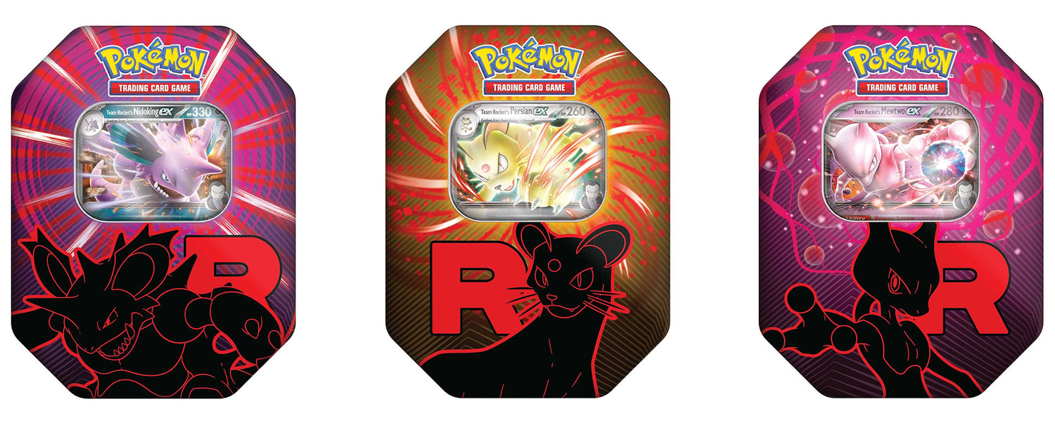 Aim for World Domination with Team Rocket! Bring your ambitious plans to fruition by joining forces with some of Team Rocket’s toughest Pokémon! With this tin, choose the strategic mind of Team Rocket’s Mewtwo ex, the potent toxins of Team Rocket’s Nidoking ex, or the prideful power of Team Rocket’s Persian ex as a foil promo card, then discover more Pokémon and Trainer cards inside a handful of booster packs.