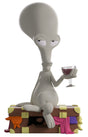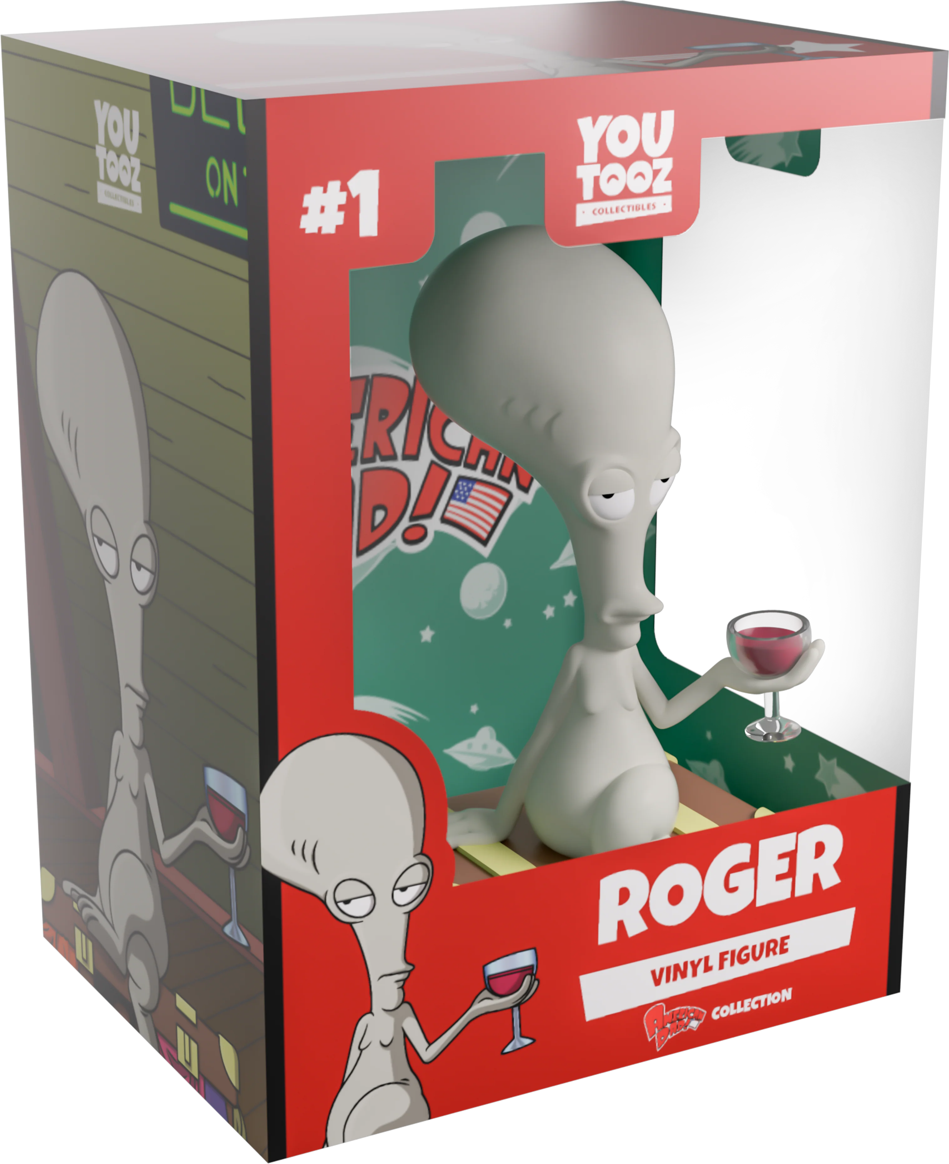 Roger's here, and honestly, we've never been happier! The truest diva of divas has landed for his new role as a Youtooz collectible. Sitting cross-legged at 4.2 inches tall atop a costume trunk with colorful clothes poking out from the opening, Roger holds a glass of red wine in his raised left hand as a look of distaste crosses his face as if he just saw Francine's newest MLM. The exterior of his packaging has been illustrated to showcase Roger behind a bar in his attic, while the interior of the box is green with a pattern of spaceships, stars and planets. The protective sleeve is red with a star shooting across the bottom of the box as his figure can be seen through the large clear window at its front.