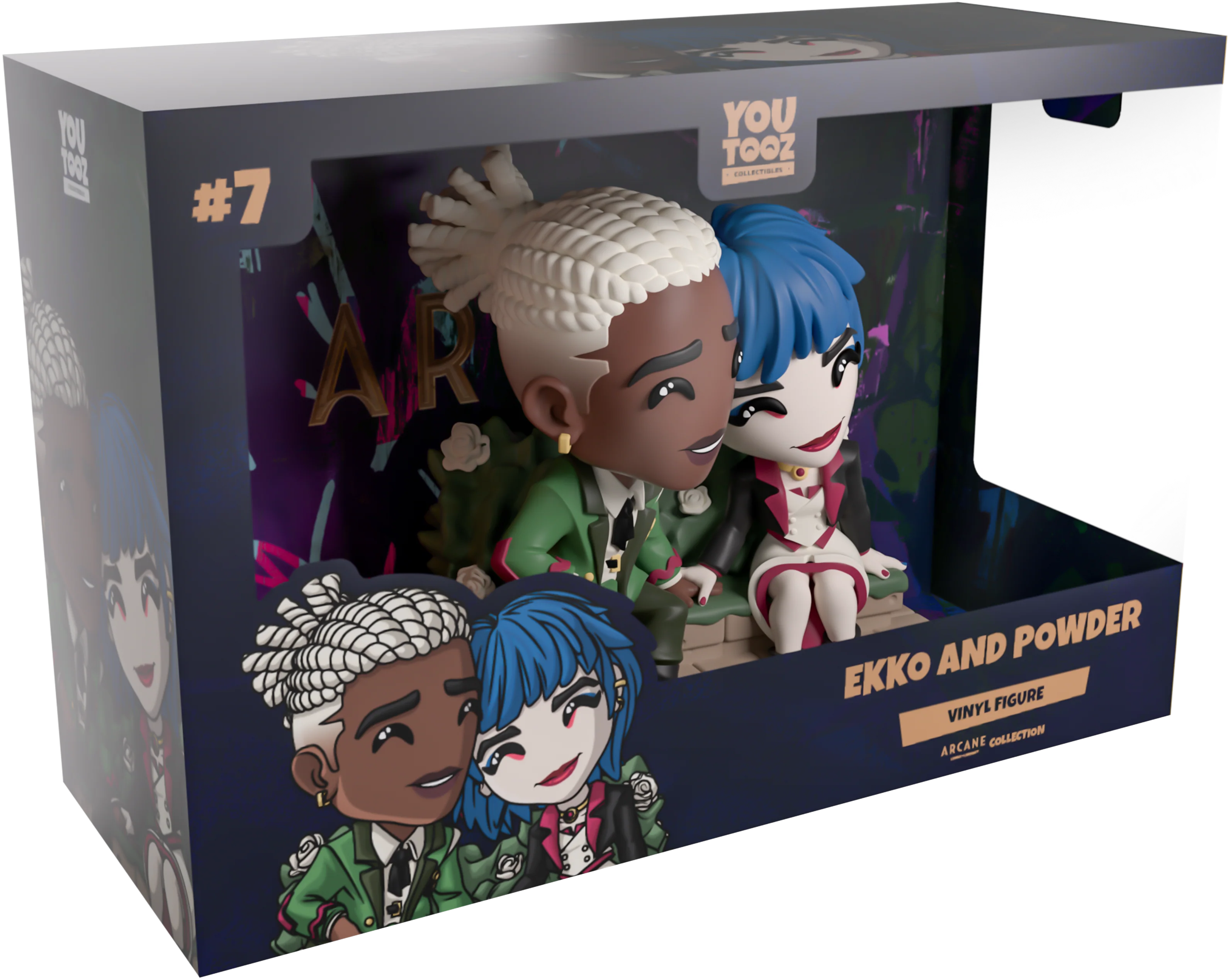 Ekko’s changed the timeline so he and Powder could spend a few extra moments together at Yotuooz! At 4.6 inches tall, this scene sees Ekko and Powder sitting atop stone steps with flowering bushes in the background as they gently rest their heads and hands together to share a soft moment. With gentle smiles, as they enjoy just being together, Ekko looks off to the side as his light braided hair is tied at the back and he wears a two-tone green suit over a pale white shirt, while Powder’s messy blue fringe sits over pink and blue eyes as she wears a cropped black and maroon jacket over her cream coloured dress. The exterior of their packaging is covered in vibrant pink and blue scrawlings over a dark background that meets a thick green graffiti. These then work their way onto a smudged purple and red-yellow, while the protective sleeve is a dark blue with a simple golden frame as their figures can be seen through the large clear window at the packaging’s front.