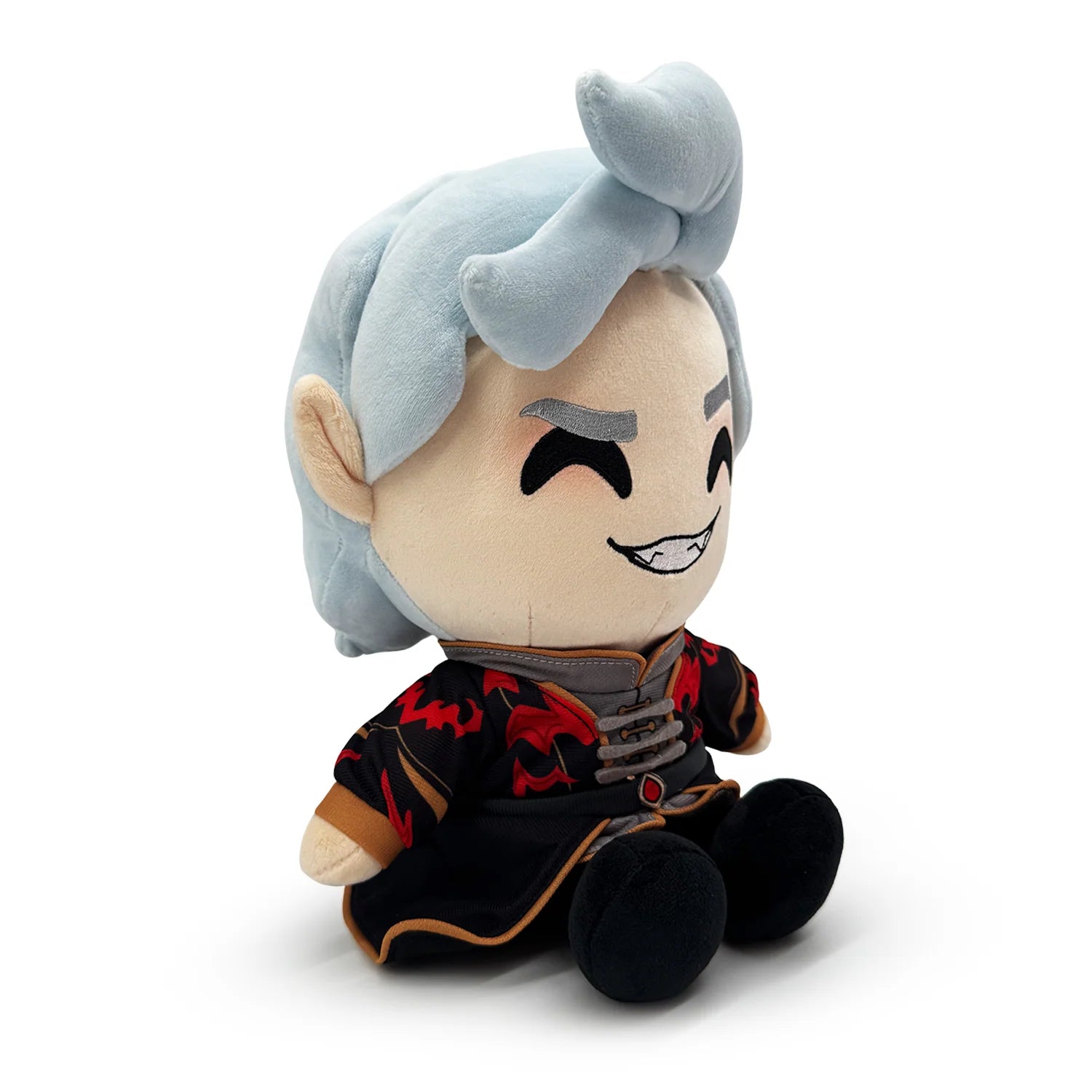 Finally the ritual is complete, the power has been siphoned from Cazador and funnelled right into everyone's favorite, now all-powerful, blood sucker Astarion! Sitting at 9 inches tall with his legs kicked forward, he's dressed in black shoes and pants with an ornate grey tunic underneath a rich trench coat emblazoned with red bat designs. With a sharp-toothed smirk resting underneath shadowed eyes, a playful eyebrow raises underneath luscious light grey hair that sweeps to the side effortlessly. This plush is packed to the seams with 100% PP cotton and is made of the softest minky and tricot materials with accents in felt, perfect for cuddling or taking over Baldur's Gate with!