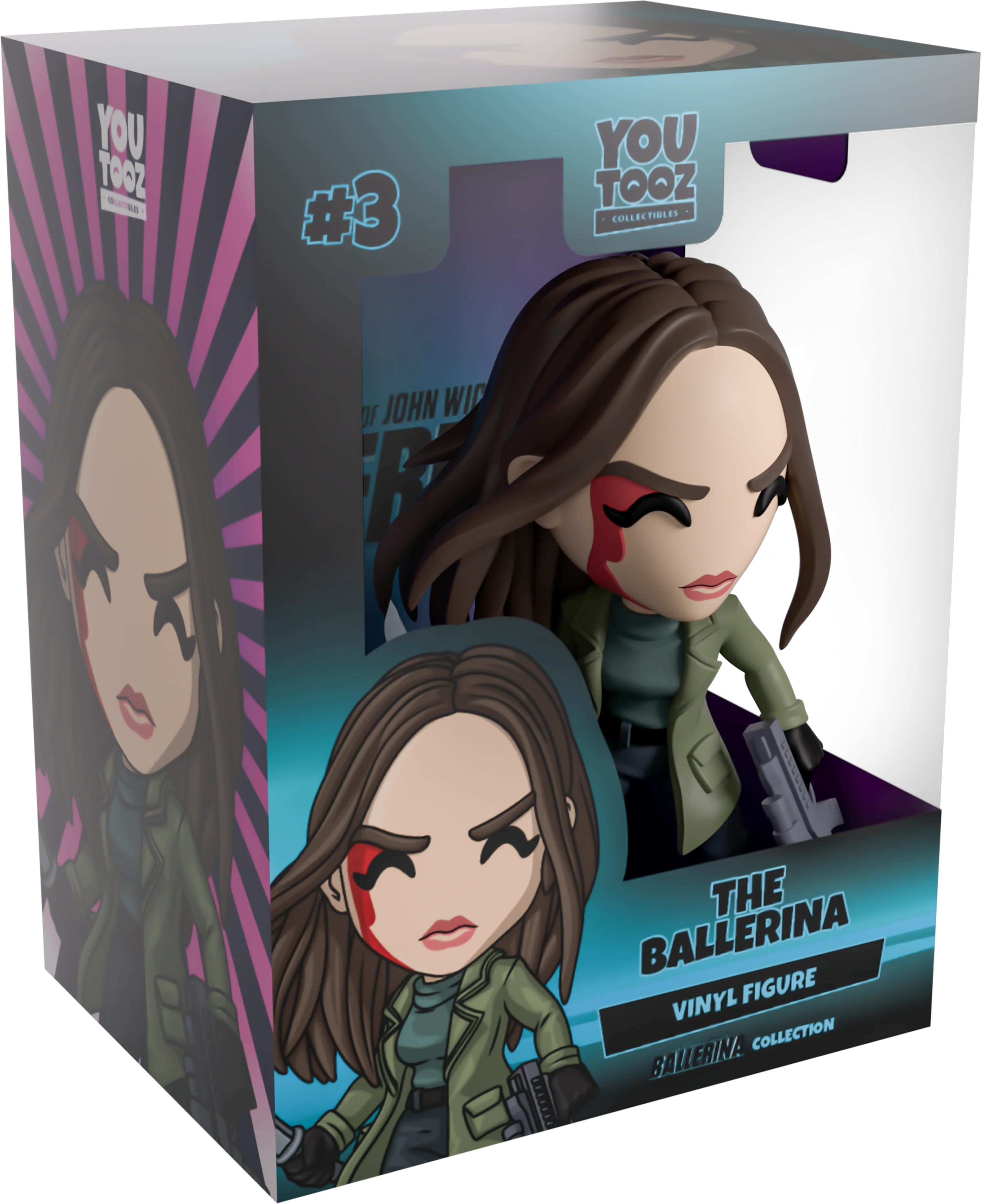 The Ballerina’s quest for vengeance has led her to Youtooz in search of her next victim! Standing at 4.3 inches tall with a katana held in her right hand and a machine gun in the left, long flowing brown hair fans around her blood-smeared face as she stares onward. With an army green coat flicking to the side, she wears a dark sweater with a thick collar and grey pants, as black gloves match her thick boots.