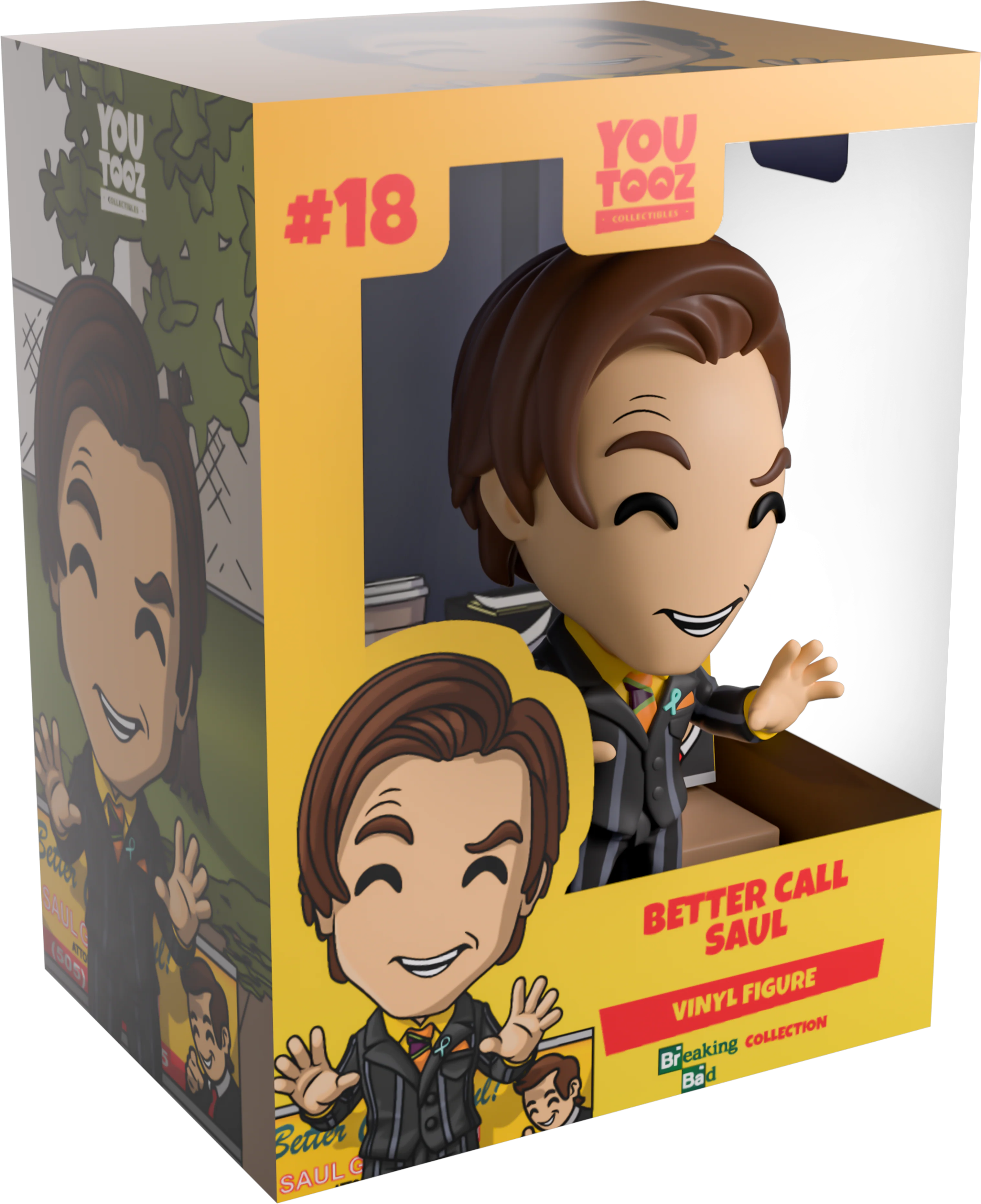 Don't worry friends, we've got the best lawyer on speed dial! Saul is trying a new case and has returned to Youtooz for research! Standing at 5 inches tall in front of his bus bench advertising his law services, his hands spread out in as an eyebrow raises beneath slicked brown hair! Always dressed looking his best for the courtroom, he wears a striped black suit over a yellow shirt and multicolored tie. The exterior of his packaging then looks onto an empty park as his figure can be seen through the large clear window at its front.