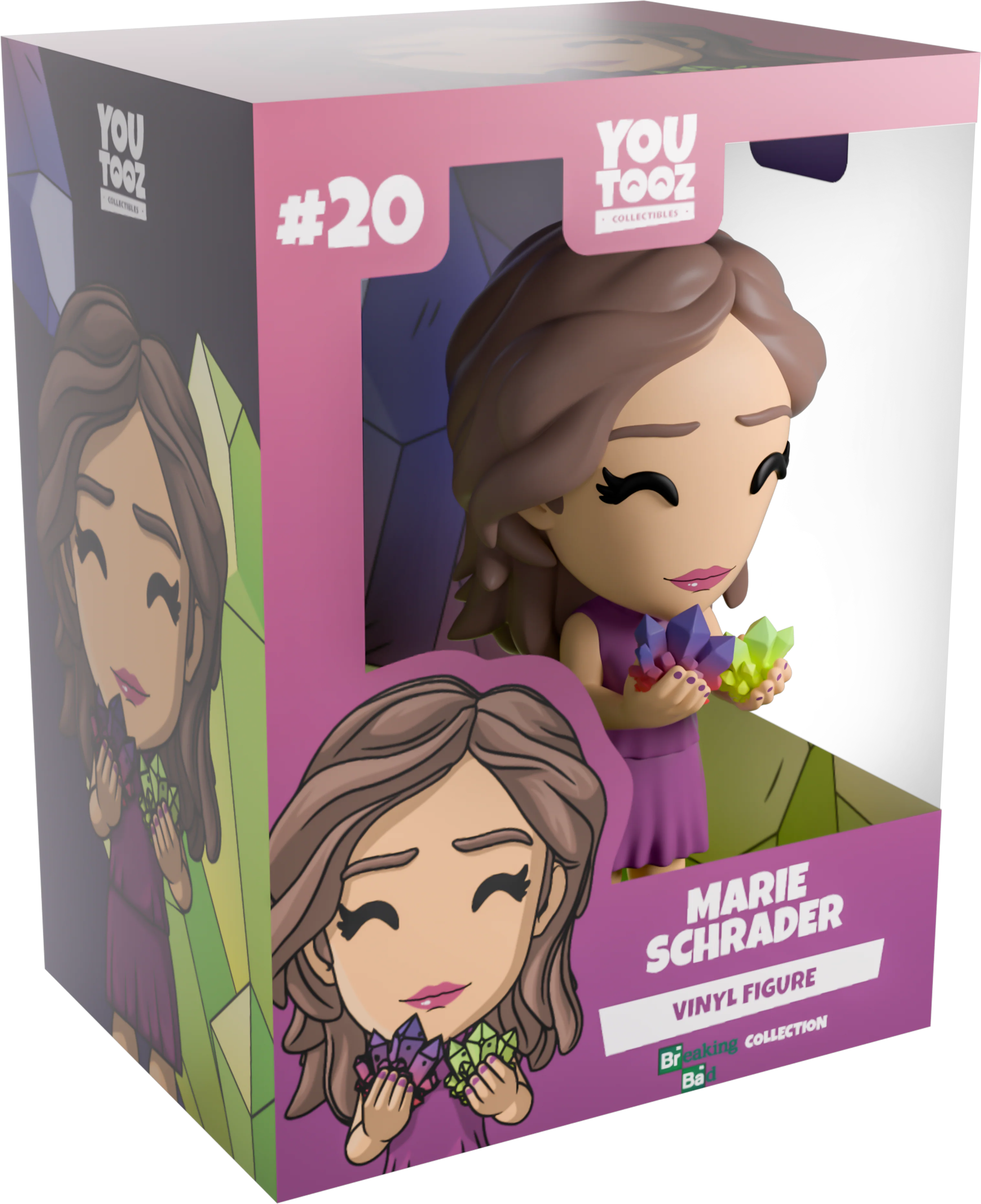 It takes a woman to get the job done! Finally Marie has joined us at Youtooz to make her figure debut! Standing at 4.8 inches tall and dressed in a sleeveless purple dress and matching shoes, in her hands she holds purple and green 'crystals' as a soft smile crosses her face and long brown hair is tucked behind her ears.