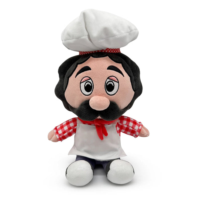 This isn’t one of Pasqually’s jokes, he’s really arrived at Youtooz for his plush debut! Sitting at 9 inches tall with a thick moustache at the centre of his face underneath half lidded eyes and slightly raised eyebrows, shaggy black hair covers his head below a floppy white chef hat that has a red checkered base. Wearing a neckerchief that hangs over the white apron tied around his waist, he’s dressed in a long sleeve checkered shirt, blue pants and black sneakers. This plush is packed to the seams with 100% PP cotton and is made of the softest minky material, absolutely perfect for cuddling or cooking up a storm with!