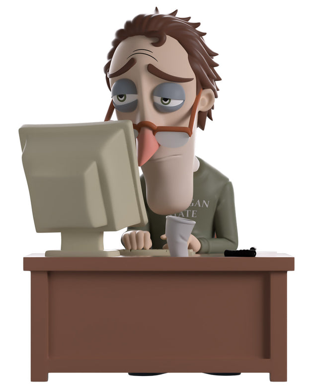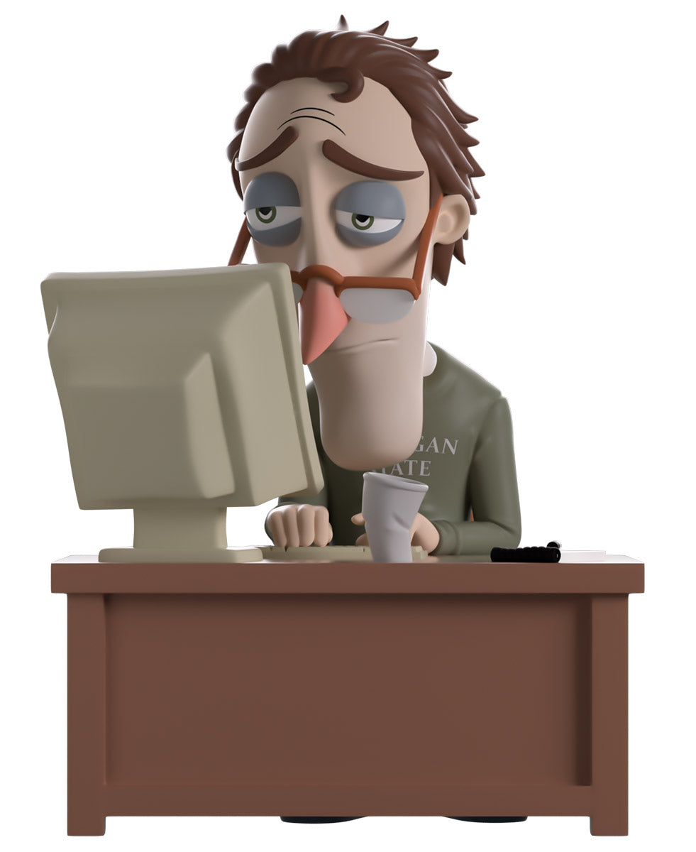 We managed to drag Charlie away from his busy, suuuuper important, work for a Youtooz debut! Wait… Is he working again!? Sitting at 4.7 inches tall and drearily obsessed with his work as he hunches towards the bleak computer monitor on the wooden desk at his front, orange glasses fall down his long nose as his eyebrows raise apathetically over half-lidded eyes and messy brown hair is slicked back. Wearing a mossy green sweater and blue jeans along with sandals, his slumped posture really emphasizes how truly exhausted he is.