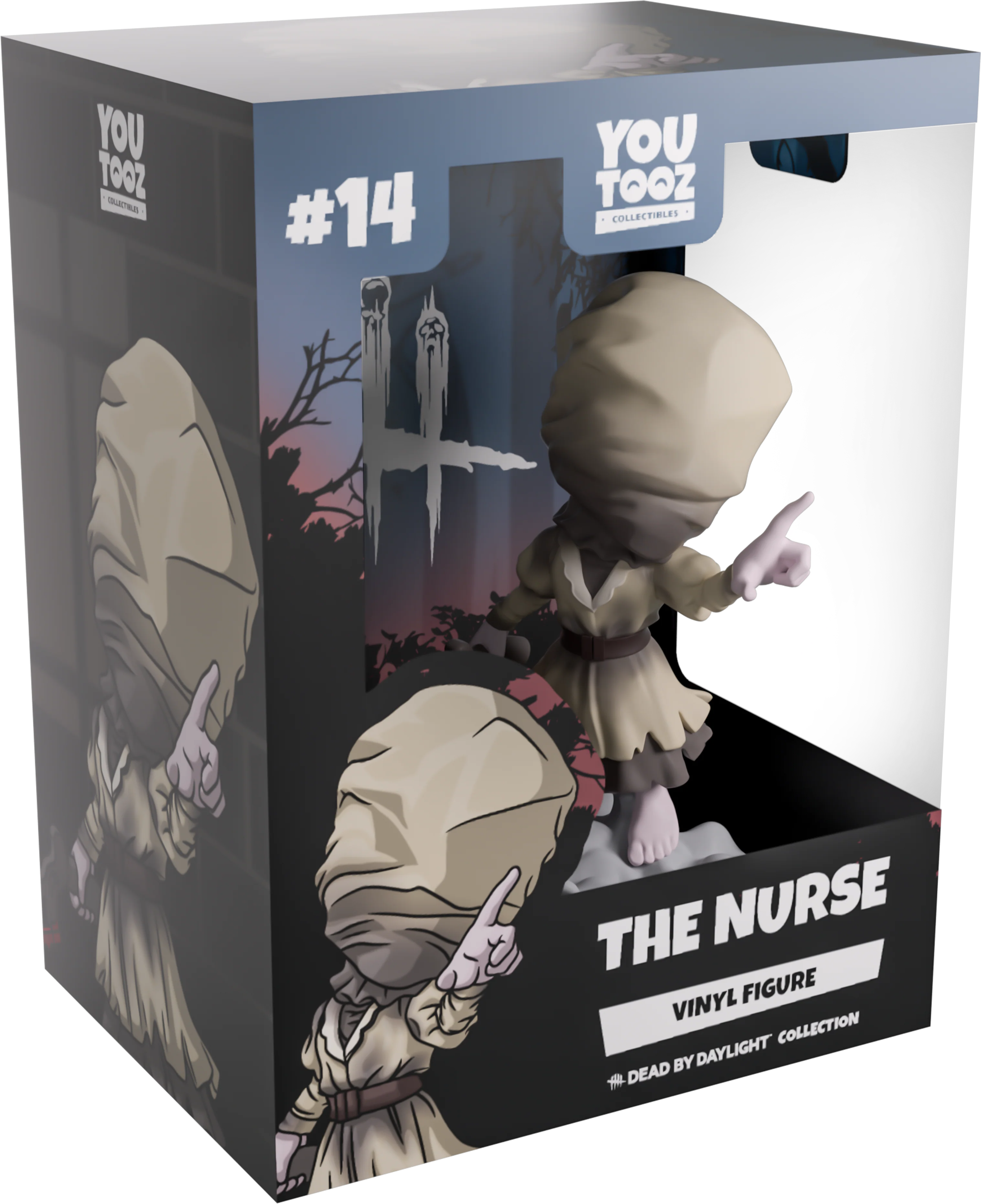 Nurses work so hard, sometimes they need to let out a little steam and murder some people! At 4.8 inches tall and dressed in ragged light brown scrubs as she floats up from the swirling smoke under her bare feet, her face is covered with a cloth hood as she hold a bloody saw in one hand and points towards her next victim with the other. The exterior of her packaging has been illustrated to showcase the nurse in front of a decrepit brick wall. While the interior is a black silhouetted forest with a glowing red and blue haze and the white ‘Dead by Daylight’ logo at its back, this grim motif then continues onto the protective sleeve with dark trees surrounding it completely as their figure can be seen through the large clear window at its front.