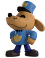 Don't be scared, Dog Man is on the case! This officer stands at 4.6 inches tall in a wide stance, dressed wearing black shoes, dark blue pants and his lighter blue shirt and hat; both complete with the golden police shield on his chest and hat. His dog face is smiling as it is slightly turned up with his nose to the sky to smell out crime! The windowed display box has been illustrated to showcase a grassy hill under a blue sky as a squirrel runs by. The interior of the box is a pattern of blue stripes and polka dots. The protective sleeve continues the inner box design but with a pattern of yellow and blue stripes.