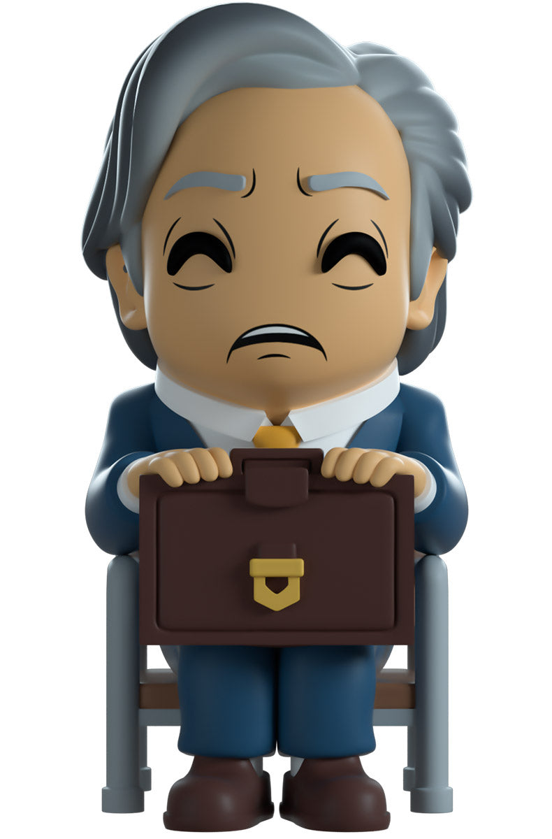 Are you in need of some legal advice? Well Doug’s arrived at Youtooz to… help? Sitting at 4.5 inches tall in a metal and wooden chair and holding onto his brown suitcase which rests on pressed together knees, his face can’t hide any concern as a slightly open mouth curves downwards and his eyebrows furrow. With his grey hair combed back and to the side, he’s dressed in a smart blue suit with a white shirt, yellow tie and brown shoes. The exterior of his packaging sees Doug sitting in a dirty beige office. While the interior is filled with dimly lit coloured balls which spill onto the protective sleeve as his figure can be seen through the large clear window at the packaging’s front. This collectible ships in a matte, embossed, protective outer sleeve and a custom sized plastic protector for maximum protection during shipping.