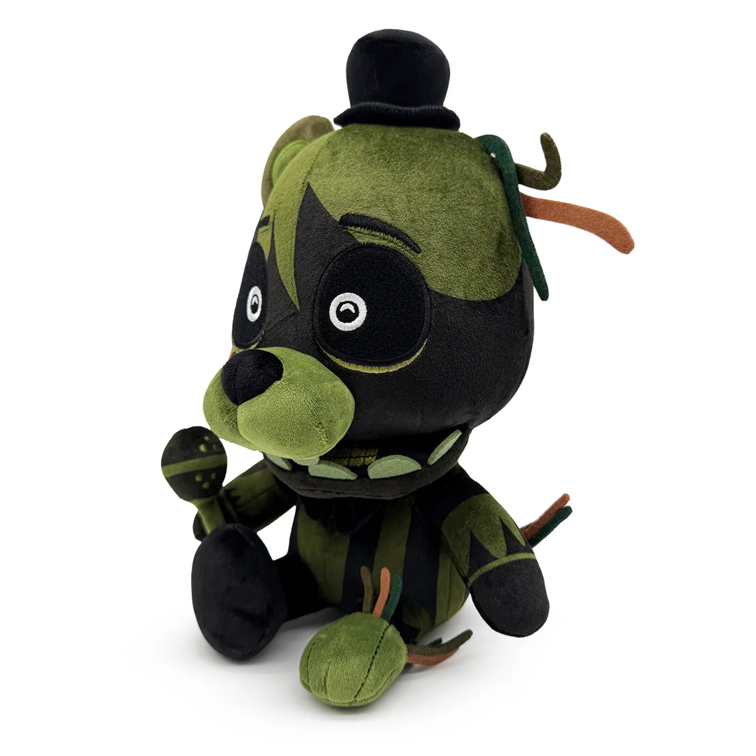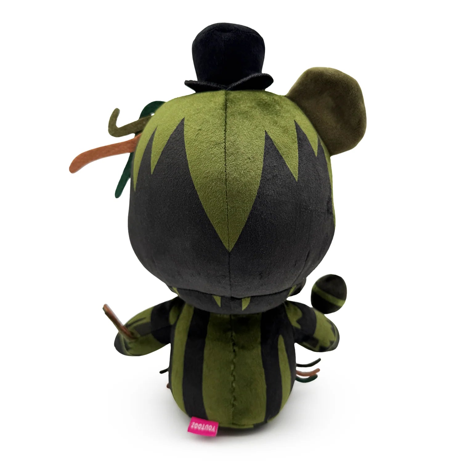 Freddy’s snuck his way through the shadows and back into Youtooz! Sitting at 9 inches tall with a pair of bright white pupils shining out from the deep eye sockets of his head, a menacing smile peers through the rounded teeth of his open mouth as a small top hat sits atop his head next to wires that poke out from his missing ear. Colored a deep green and with dark shadows cast across his body, he holds a microphone in his right paw as his left leg is missing and wires hang out from a dilapidated body. This plush is packed to the seams with 100% PP cotton and is made of normal and sublimated minky materials with accents of drawstring, absolutely perfect for cuddling or being your best friend….