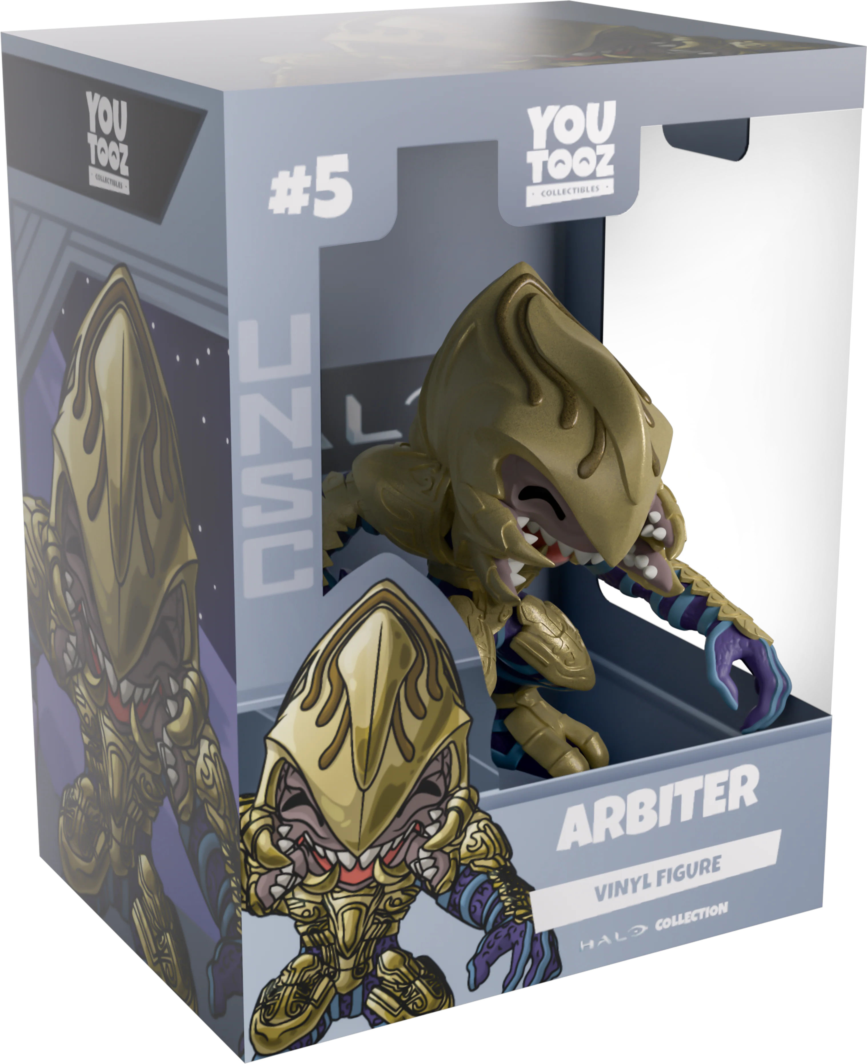 The Arbiter has allied with Youtooz for their very own vinyl debut! Taking a step forward at 4.1 inches tall and holding a pulsing energy sword in their right hand as they prepare to launch forward for a life-ending lunge, the mandibles of their grey face are lined with teeth and open up from an open snarling mouth. Wearing intricately patterned golden armour that curls over their head, torso, legs and arms, blue straps run along their scaled purple body which is protected underneath. The exterior of his packaging sees an armada of alien ships passing across a Halo, while the light grey interior is covered in angled patterns which extend onto the protective sleeve with the UNSC logo as his figure can be seen through the large clear window at the packaging’s front.