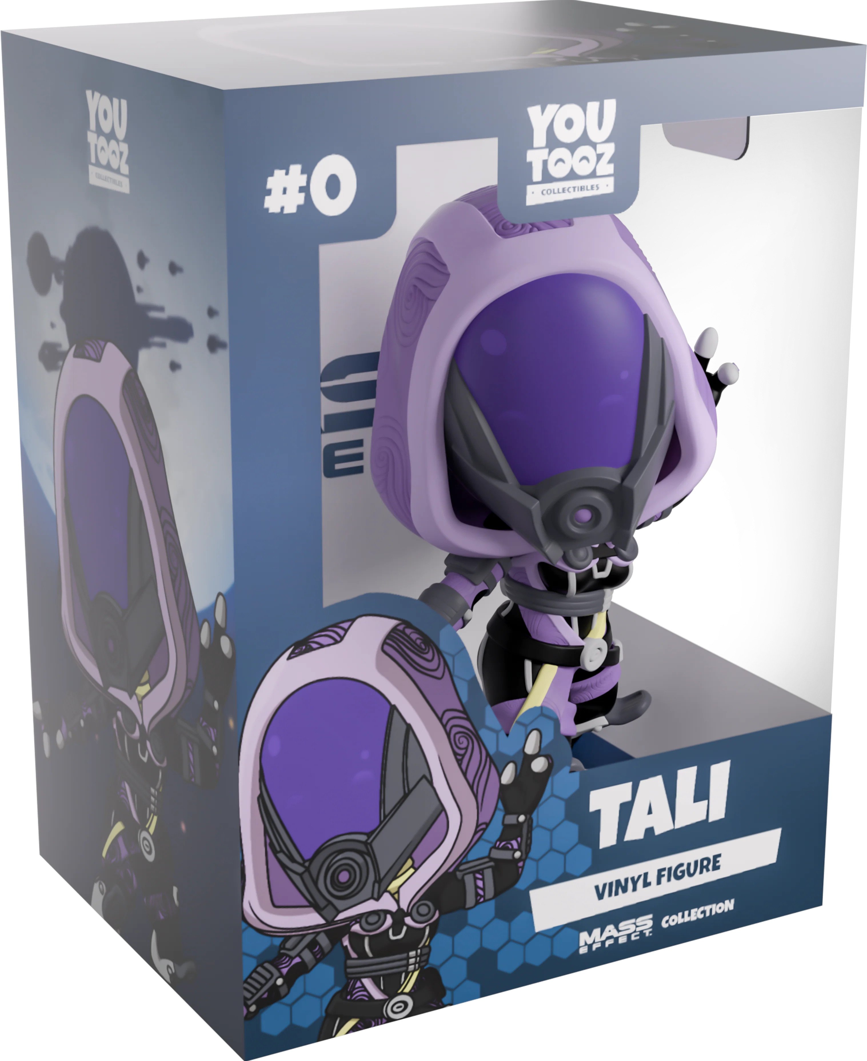 We’re in need of some desperate mechanical repairs and Tali’s arrived to help us get running again with her Youtooz debut! Standing at 4.3 inches tall with her arms outstretched as she points a 3-fingered hand toward the sky, her face is covered by a long purple visor as her helmet curves forward to a circular mouthpiece. With a thick purple hood adorned with swirling patterns draped over her head that runs down her body to wrap around her waist and thighs, she wears a black belt around her waist as a dagger is strapped to the side of her white boot. The exterior of her packaging sees a fleet of spaceships launching through a star-filled sky. While the interior is a stark white with deep blue running around the top and bottom, this then continues on the protective sleeve where her figure can be seen through the large clear window at the packaging’s front. This collectible was designed in collaboration with community member @therealracckun.