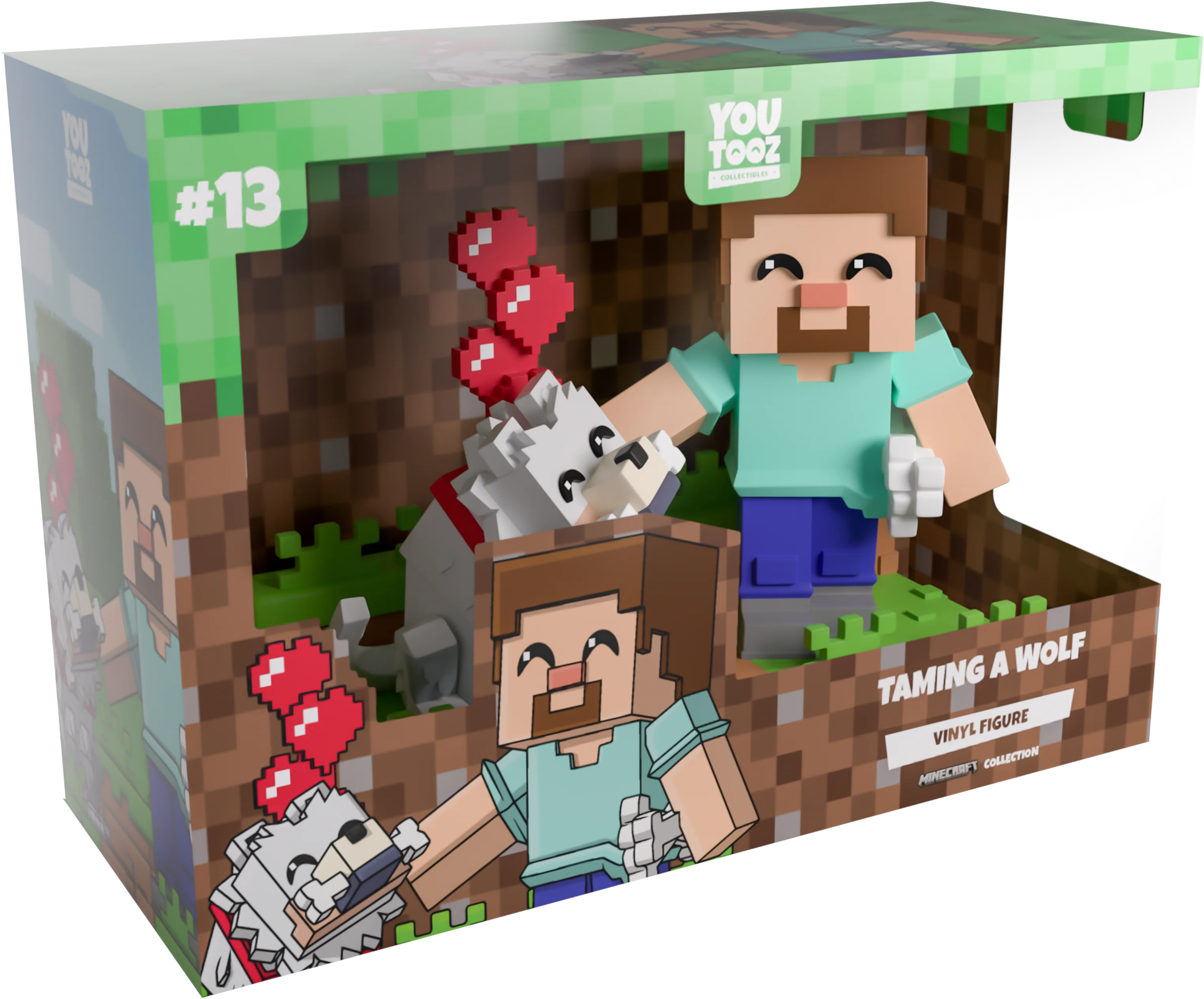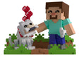 Move over dogs, cause now Wolves are man’s best friend! Well… in Minecraft of course… At 4.9 inches tall, this scene sees Steve lovingly reaching out a blocky hand to the happiest tame Wolf who looks up delightedly with a bone held in their mouth and a bunch of bright red hearts rising from their head. Not knowing just how many it would take to win over his fluffy new friend, Steve has a bundle of bones tucked under his arm as he wears an iconic aqua shirt and blue pants with brown hair covering his square head. The exterior of their packaging is a first-person look at a delighted wolf. The interior surrounds them in brown dirt blocks, which continue onto the protective sleeve as their figures can be seen through the large clear window at the packaging’s front.