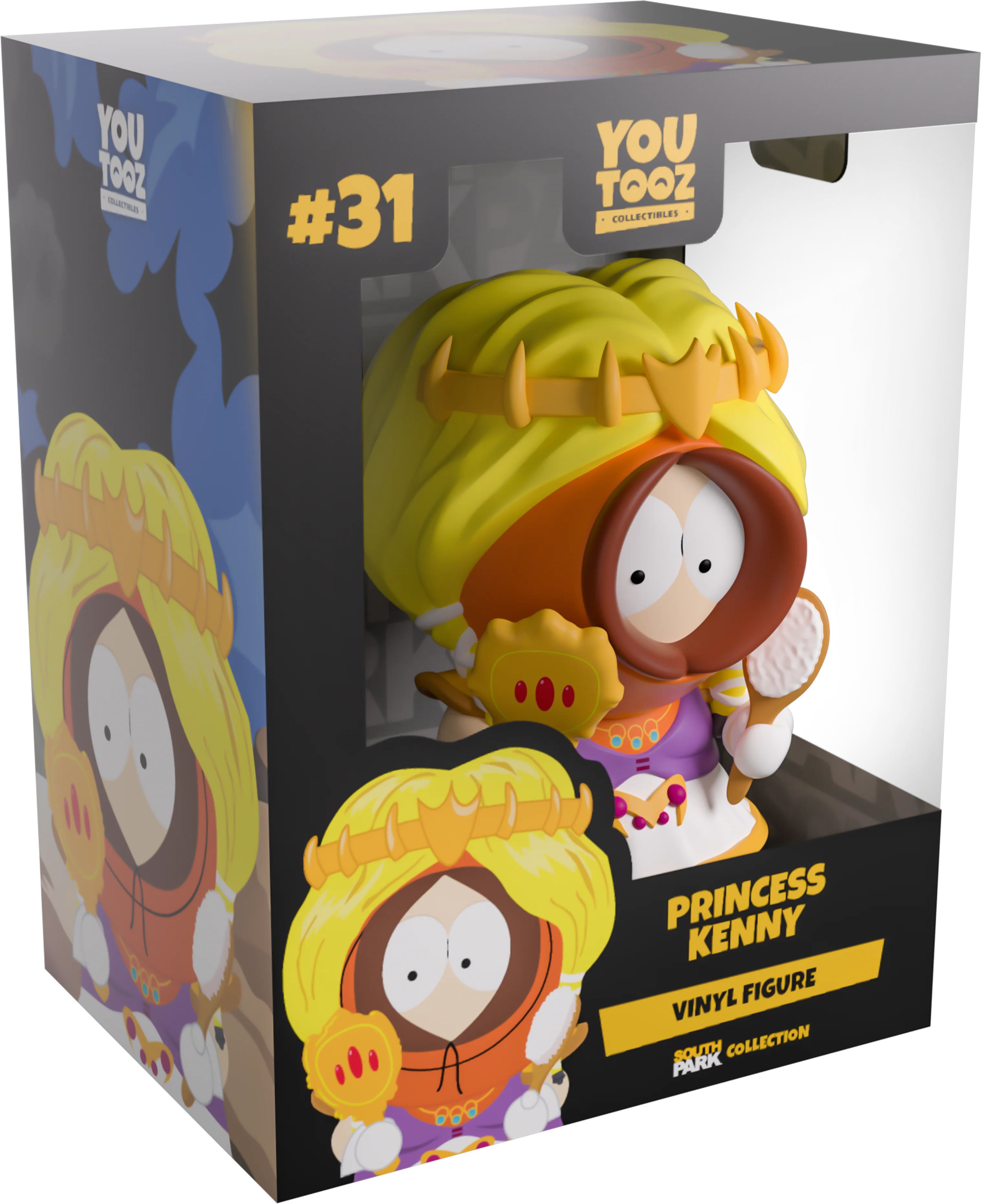 There's nothing distressing about this damsel's return to Youtooz! Standing at 3.5 inches tall and holding a brush and golden mirror to his front, long blonde hair rests wraps around his orange hood as a golden tiara resting on the front. Wearing a purple top that leads into a flowing white dress with a gold trim, he wears long white gloves as a jewelled necklace hangs on his chest. The exterior of his packaging sees smoke billowing through the sky behind a tall treehouse. The interior is then a simple greyscale repeating pattern of the South Park Logo, while the protective sleeve sees the four boys' faces peeking from the corners over a rich black background, as his figure can be seen through the large clear window at the packaging’s front.