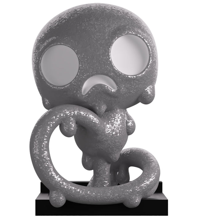 Dogma has emerged from the fuzzy static of an old television to arrive at Youtooz! With a lifeless face and sunken eyes staring out from above a distraught frown, their glittery body elicites the white noise of an old TV as their oozing body floats at 3.5 inches tall with a long umbilical cord wrapping around it. The exterior of their packaging sees a spiral of static curling out of a tv screen, this continues to the interior filling the packaging completely. The protective sleeve then looks into a dungeon room as their figure can be seen through the large clear window at the packaging’s front.