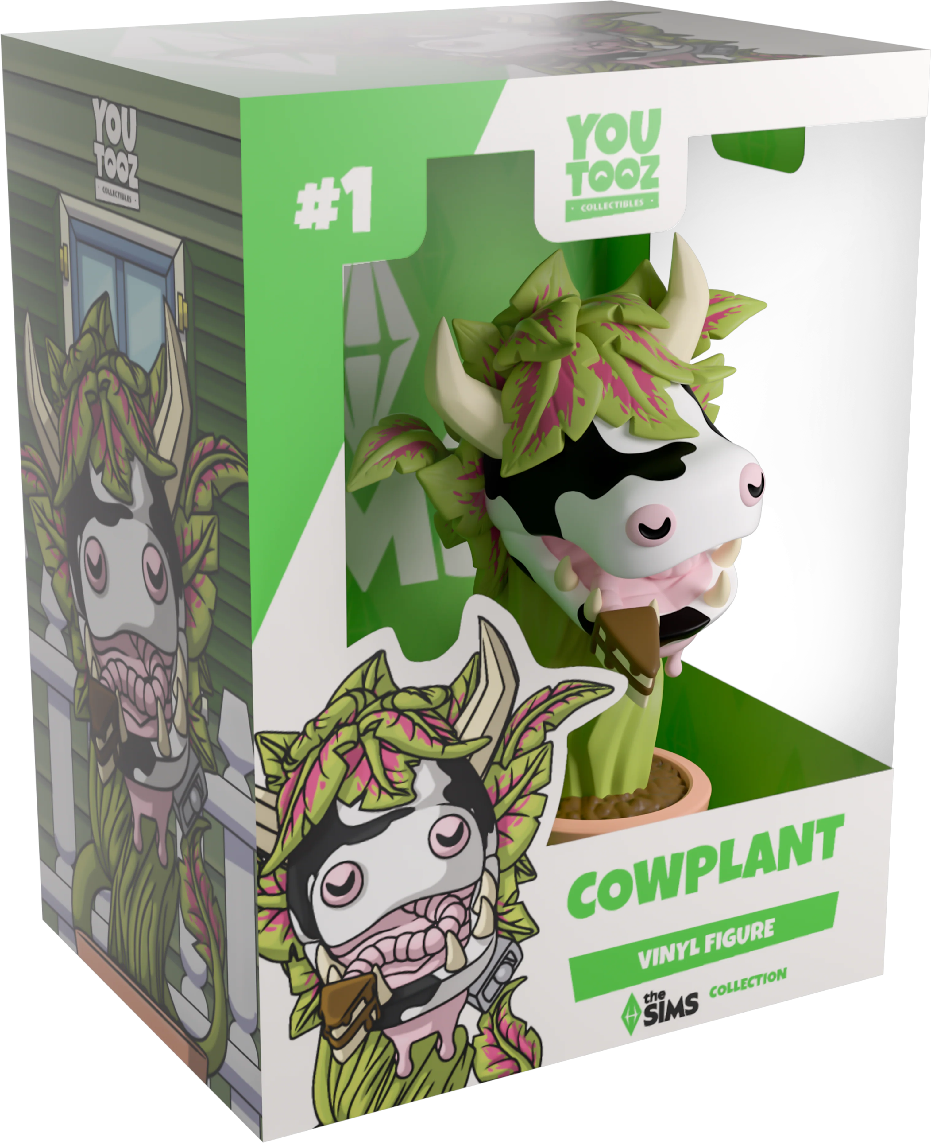 If you love weird pets, look no further than the Cowplant! This unique plant-bovine hybrid requires plenty of love and attention to thrive, and will be a rewarding companion, if they don’t eat you… At 4.9 inches tall, this figure showcases the iconic Cowplant growing from an earthen pot. Lush green roots extend from its base, the stem of the plant reaches for the sky, a black and white cow head protrudes from green and red leaves, and a slice of cake enticingly hangs from its open mouth. The exterior of the packaging showcases a garden of growing cowplants, while the interior is a light green with a plumbob pattern. This collectible was designed in collaboration with community member @therealracckun.