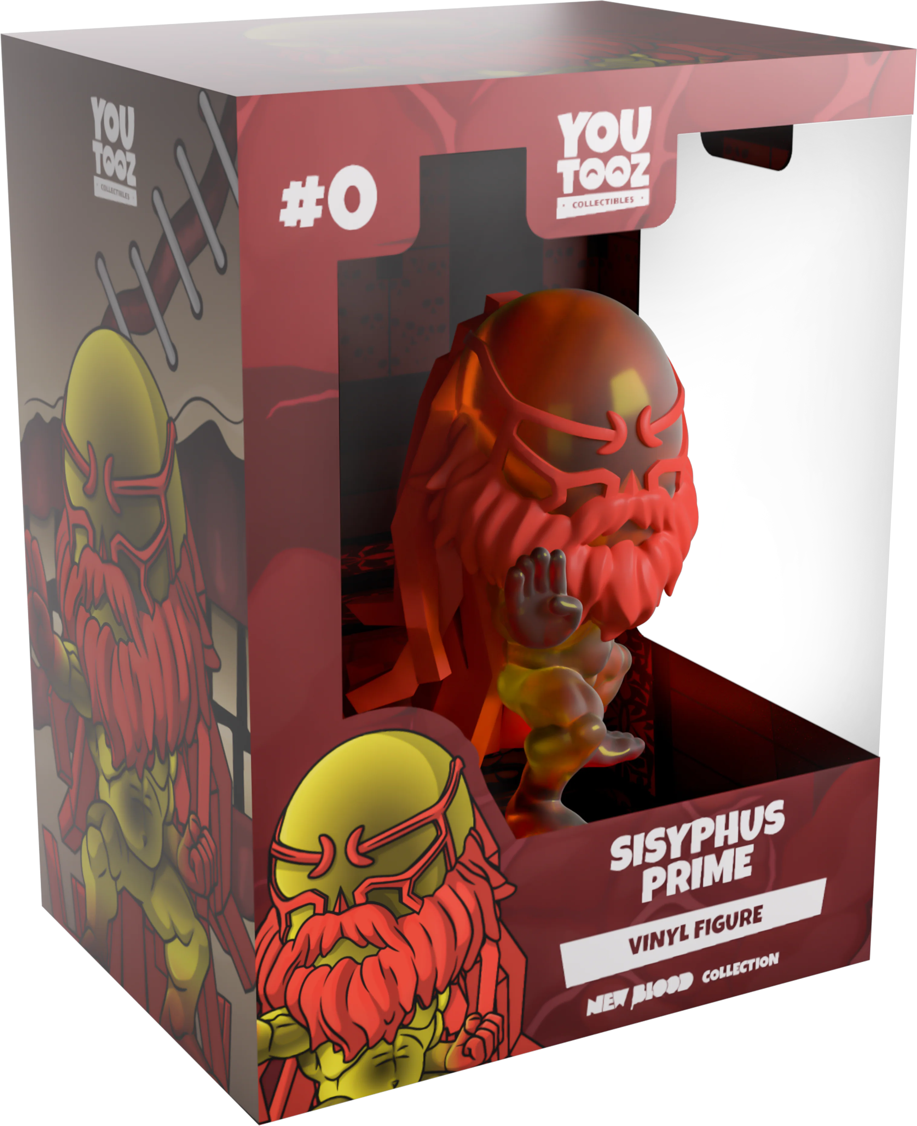 Youtooz has descended to the Inner Sanctum and has freed Sisyphus Prime for his Youtooz debut! Crouching at 4.1 inches tall with a hand thrust forward as a clenched fist is drawn back behind his body in preparation to crush his foe, a bushy red beard fans around his scowling face that has thick lines leading back to jagged flowing hair that curls behind his feet. With muscles popping out from an intensely hulky yellow body, his hands and feet glow a deep red with power. The exterior of his packaging is a close-up of jagged teeth with stapled pale flesh, while the interior looks into an illuminated red room with sigils on the floor. The protective sleeve is then covered with a fleshy red membrane, as his figure can be seen through the large clear window at the packaging’s front.